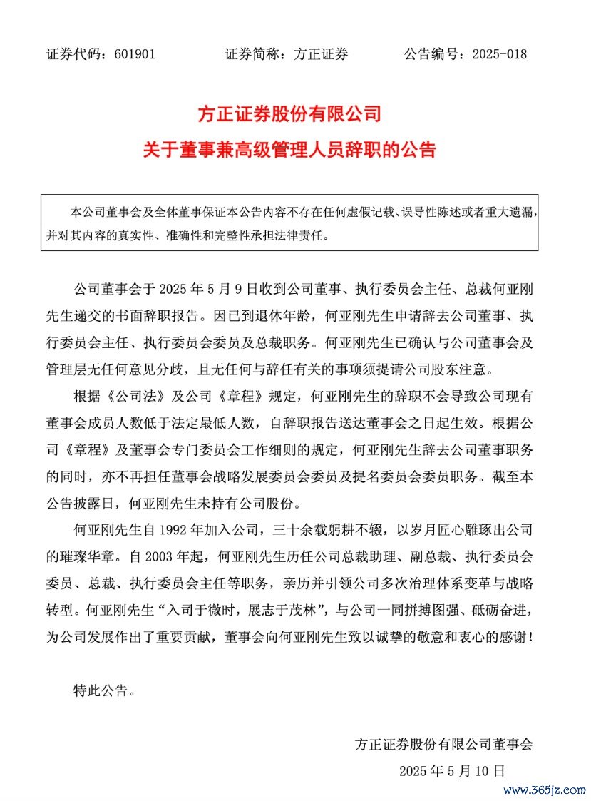 据方正证券公告配资股配资,其公司董事会于5月9日收到公司董事、执行委员会主任、总裁何亚刚的书面辞职报告。因已到退休年龄,何亚刚申请辞去公司董事、执行委员会主任、执行委员会委员及总裁职务。何亚刚已确认与公司董事会及管理层无任何意见分歧,且无任何与辞任有关的事项须提请公司股东注意。