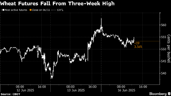 小麦期货周一一度下跌1.5%,较上周末创下的三周高点有所回落。伊朗和以色列相互攻击,导致上周五大宗商品价格受到油价影响,但随后价格有所回落,因出口基础设施未受损。